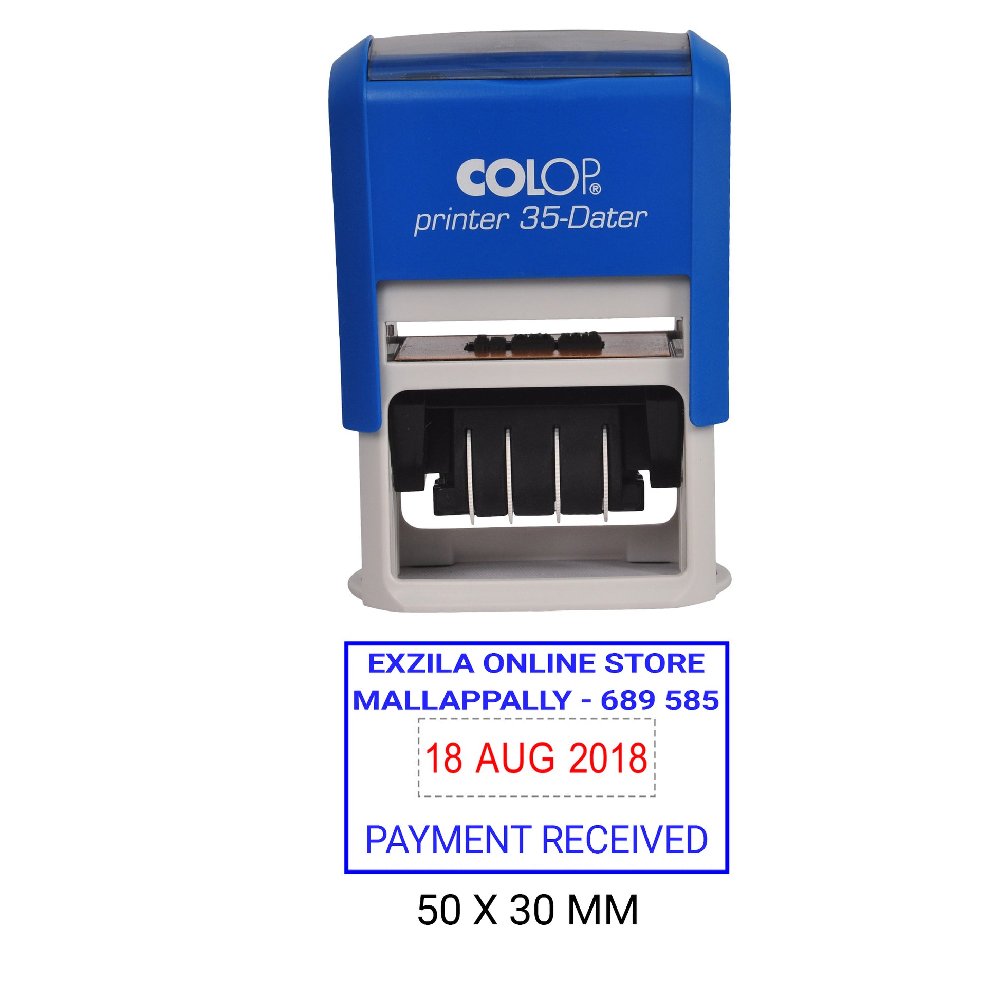 Buy COLOP 50x30 mm self-inking dater stamp with two-colour printing. Custom text in blue, date in red. Perfect for office, invoices, and workflow stamping.