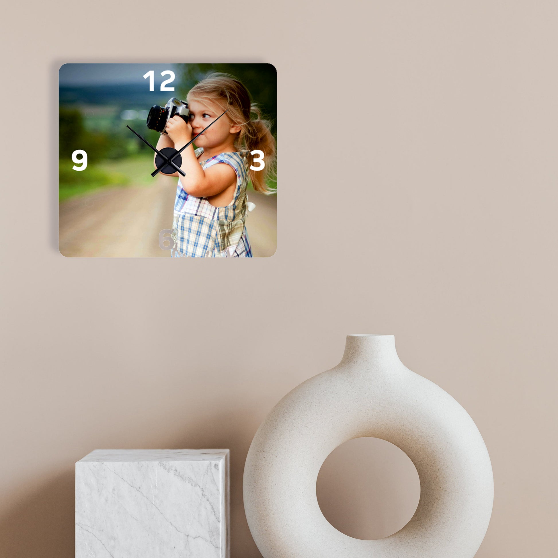 A: Our clocks are made from high-quality 3mm or 4mm clear acrylic and feature a premium silent clock mechanism. We use UV printing for vibrant, long-lasting images.